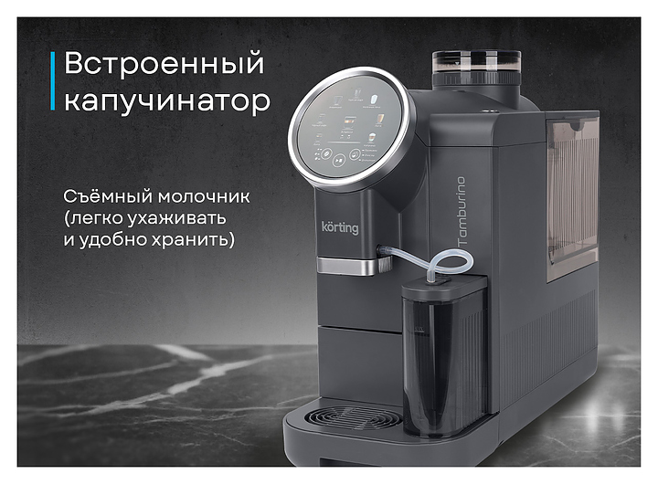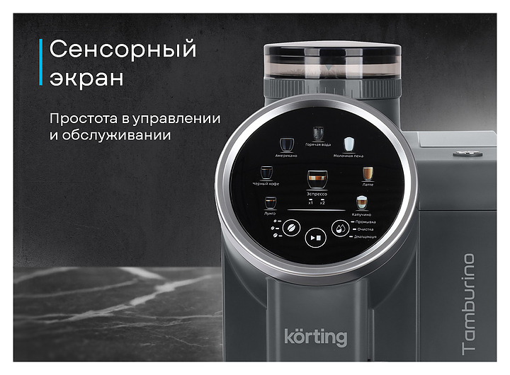 Кофемашина Korting KACM 2028 Gr Tamburino используется в домашних условиях и в небольших офисах для приготовления зернового кофе. Модель оснащена встроенным капучинатором, сенсорным экраном и встроенной кофемолкой. Съемный молочник гарантирует простой уход и удобное хранение. Корпус выполнен из металла и пластика. В комплект поставки входят фильтр для воды, съемный кран для фильтра, определитель жесткости воды и книга рецептов. Корпус выполнен из металла и стали. Особенности: