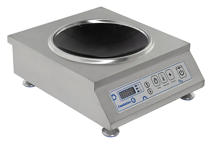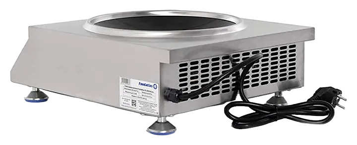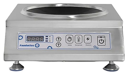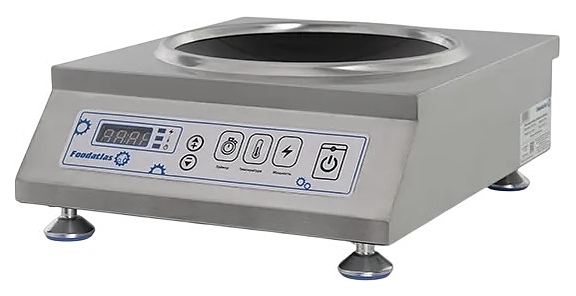 Индукционная плита Foodatlas FA-3500W Eco предназначена для приготовления блюд в Вок-сковороде или казане на предприятиях общественного питания. Модель оснащена 1 конфоркой, панелью управления с кнопками и индикаторным табло, отображающим текущие работы плиты. Индукционная технология обеспечивает передачу до 90% энергии непосредственно посуде, что значительно экономит электроэнергию по сравнению с традиционными плитами, отсутствие открытого огня и минимальный нагрев окружающей среды делают приготовление пищи более безопасным и комфортным. Рабочая поверхность выполнена из вогнутого стекла, корпус - из нержавеющей стали. Особенности: