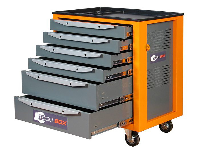 Инструментальная тележка КМК ЗАВОД TOOLLBOX Standart TBS-6 предназначена для хранения и перемещения инструментов, материалов и оснастки в мастерских, гаражах, профессиональных автосервисах и помещениях производственного назначения. Модель оснащена 6 ящиками с телескопическими направляющими, 4 колесами с резиновым ободом (два колеса неповоротные, два поворотные, одно из которых оснащено тормозом) и широкой боковой ручкой для перемещения тележки. Корпус изготовлен неразборным, сварным соединением из 1,0мм стали. Внимание! Тележка инструментальная всех исполнений, укомплектованных выдвижными ящиками поставляется в собранном виде. Особенности: