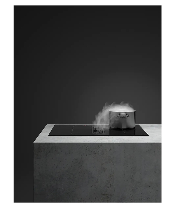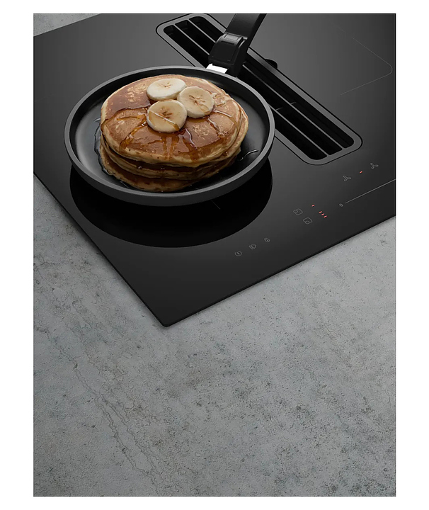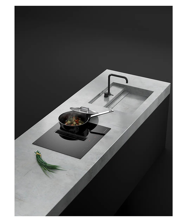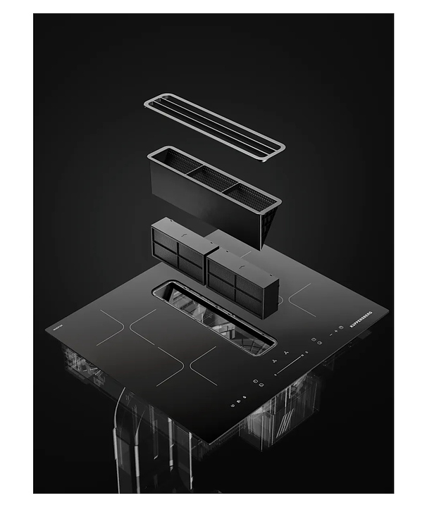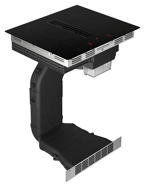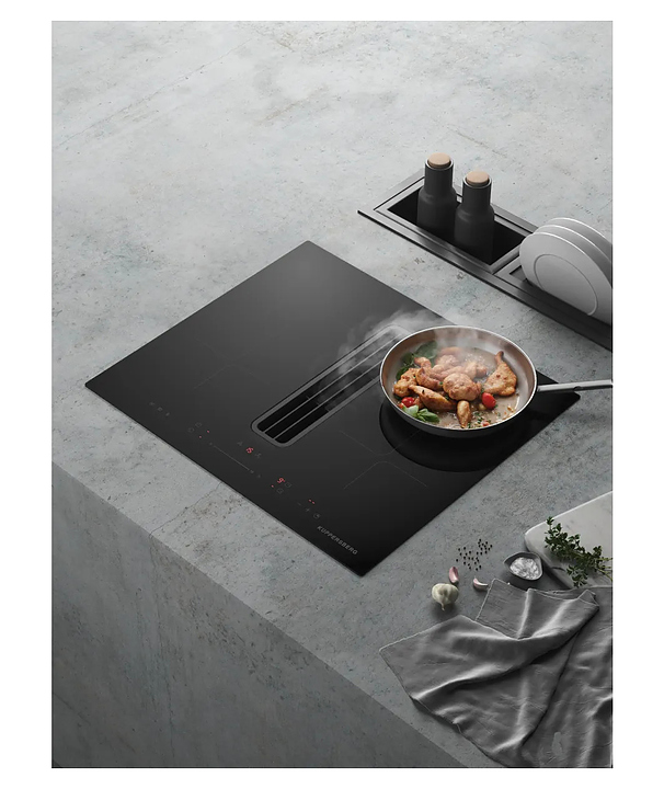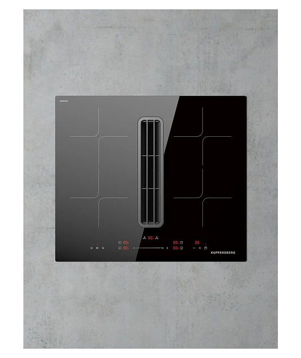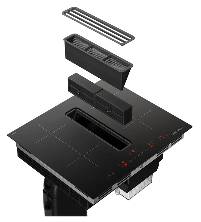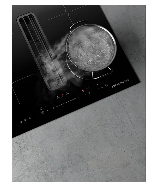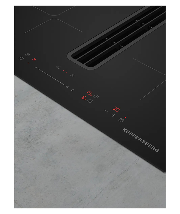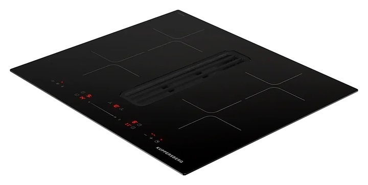 Индукционная варочная панель Kuppersberg IHI 690 предназначена для приготовления большого ассортимента блюд в домашних условиях. Принцип работы основан на непосредственном нагреве металлической посуды создаваемыми высокочастотным магнитным полем индуцированными вихревыми токами. Модель оснащена 4 варочными зонами, интегрированной вытяжкой с расположенной в центре рабочей поверхности прямоугольной воздухозаборной решеткой, кабелем питания без вилки, расположенной в центре фронта электронной панелью управления с сенсорными функциональными клавишами и 6 светодиодными цифровыми дисплеями с красной подсветкой индикации. Рабочая поверхность выполнена из высококачественной стеклокерамики ILVA черного цвета с прямой кромкой, решетка вытяжки – из стали с черной поверхностью, жироулавливающий фильтр – из алюминия.