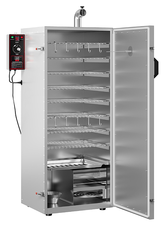 Коптильня Kocateq DSH S 08E используется на предприятиях общественного питания и торговли для горячего копчения мясных и рыбных продуктов. Модель оснащена механической панелью управления на боковой стороне для регулировки температуры и времени копчения до 120 минут. Дверь, защелки, корпус выполнен из нержавеющей стали AISI 304, дверная прокладка - из силикона. В комплект поставки входят: 8 решетчатых полок, лоток и емкость для стекания и сбора жира, Г-образная дымоходная труба с шибером, 8 крючков для подвешивания продуктов. Особенности: