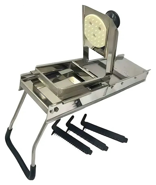 Овощерезка-мандолина Restopit рп506 предназначена для быстрой и аккуратной нарезки овощей и фруктов на предприятиях общественного питания и торговли. Модель оснащена откидным плододержателем с рукояткой и опорой с нескользящей накладкой. Корпус и ножи выполнены из нержавеющей стали, прочие компоненты – из черного пластика. В комплект поставки входят 3 сменные насадки для нарезки различной ширины. Дополнительные характеристики:
