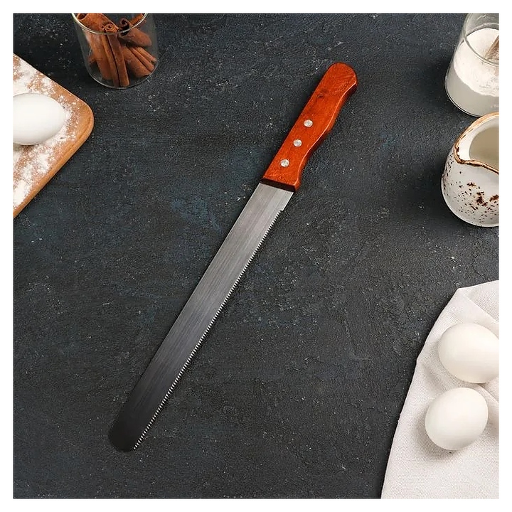 Кондитерский нож Restopit рп149 Super Doll используется для разрезания бисквитных коржей в процессе приготовления тортов, а также нарезания на куски хлебобулочных и кондитерских изделий на предприятиях общественного питания и в домашних условиях. Модель оснащена лезвием с мелкими зубцами, округлым острием для использования в качестве лопатки. Клинок выполнен из нержавеющей стали марки 3Cr14 (содержание углерода 0,3%, хрома – 14%), рукоятка – из дерева в коричневых тонах с креплением 3 заклепками. Дополнительные характеристики: