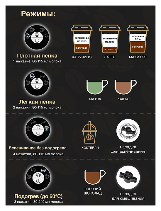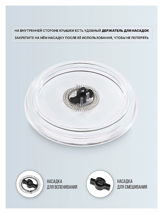 • Насадка для смешивания пригодится не только для перемешивания молока во время подогрева, но и чтобы приготовить горячий шоколад или соус