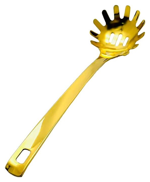Ложка P.L. Proff Cuisine 81280183 Square Tip используется на предприятиях общественного питания и в домашних условиях для раздачи спагетти. Модель оснащена перфорированной головкой с зубцами и уплощенной рукояткой с отверстием для подвешивания. Изделие выполнено из нержавеющей стали с нанесенным методом вакуумного осаждения (PVD (Physical Vapor Deposition)) покрытием золотистого оттенка. Дополнительные характеристики: