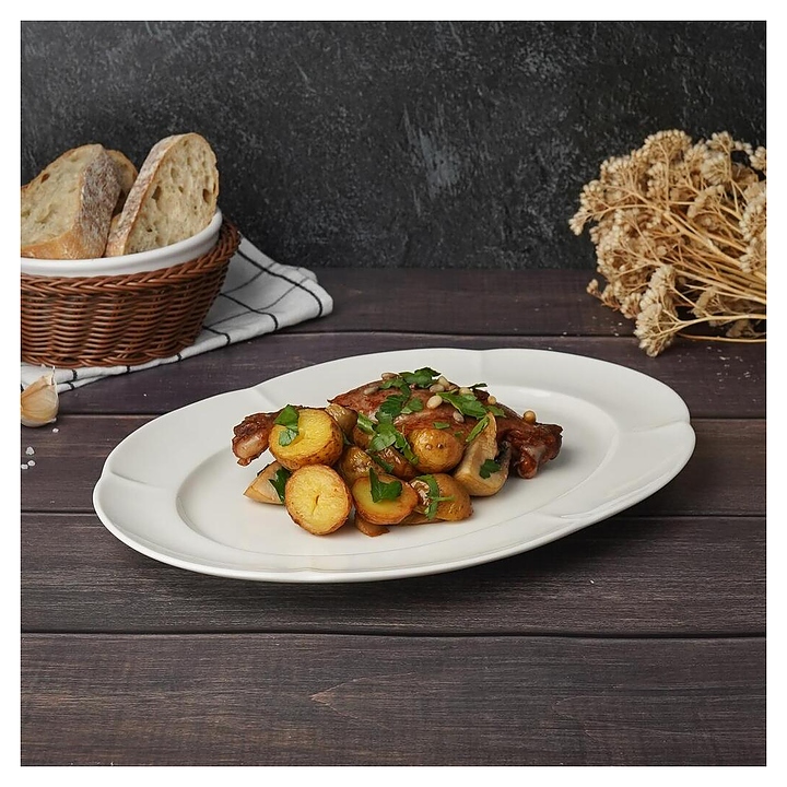 Блюдо Noble Bella 401012 используется для подачи различных закусок и блюд на предприятиях общественного питания и в домашних условиях. Коллекция отличается сбалансированным сочетанием изящных форм и рельефного декора на внешних поверхностях. Емкость овальной формы оснащена невысоким бортом с полями. Изделие выполнено из высококачественного белого фарфора. Особенности: