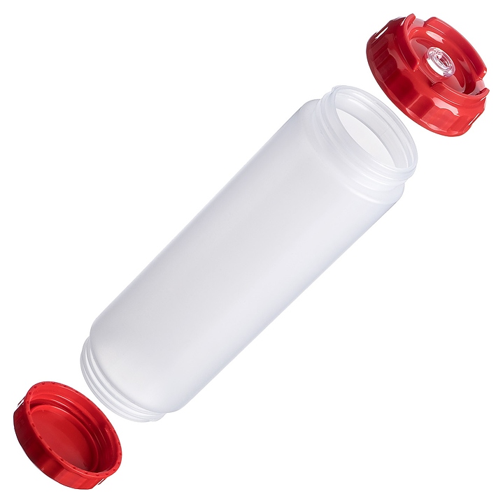 Диспенсер Gastroplast 79706 используется для дозированной подачи соусов на предприятиях общественного питания и торговли. Модель состоит из емкости цилиндрической формы, 2 завинчивающихся крышек и съемного дозирующего клапана. Емкость и крышки выполнены из безопасного для пищевой продукции пластика, крышки красного цвета, клапан – из эластичного прозрачного силикона.