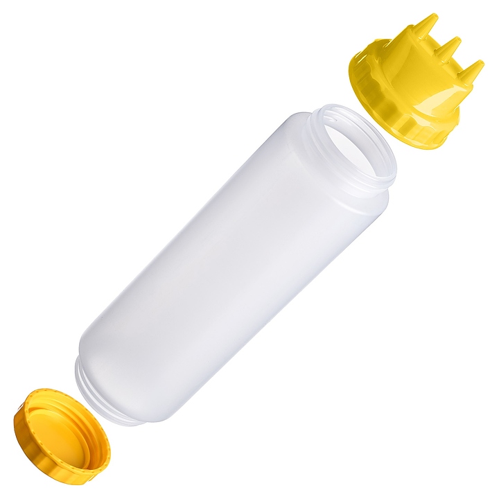 Диспенсер для соуса Gastroplast 79684 1000 мл d=7,5 см h=29 см (пластик) прозрачный c 2 желтыми крышками и 3 носиками