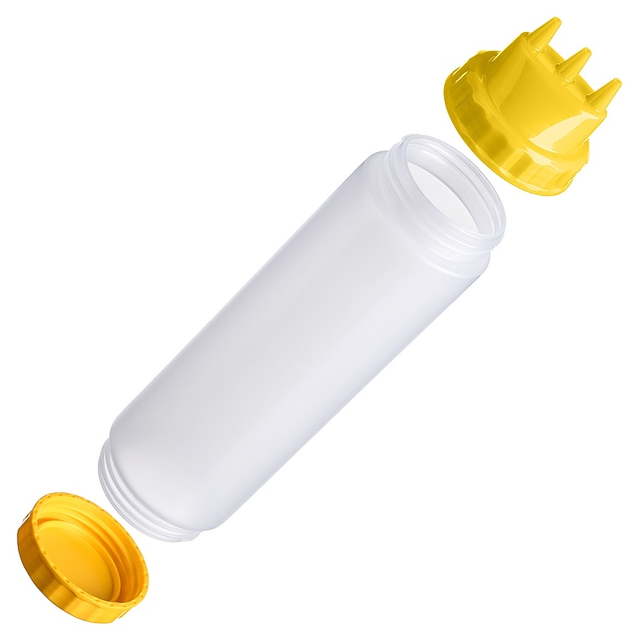 Диспенсер Gastroplast 79679 используется для дозированной подачи соусов на предприятиях общественного питания и торговли. Модель состоит из емкости цилиндрической формы и 2 завинчивающихся крышек. Изделия выполнены из безопасного для пищевой продукции пластика, крышки желтого цвета.