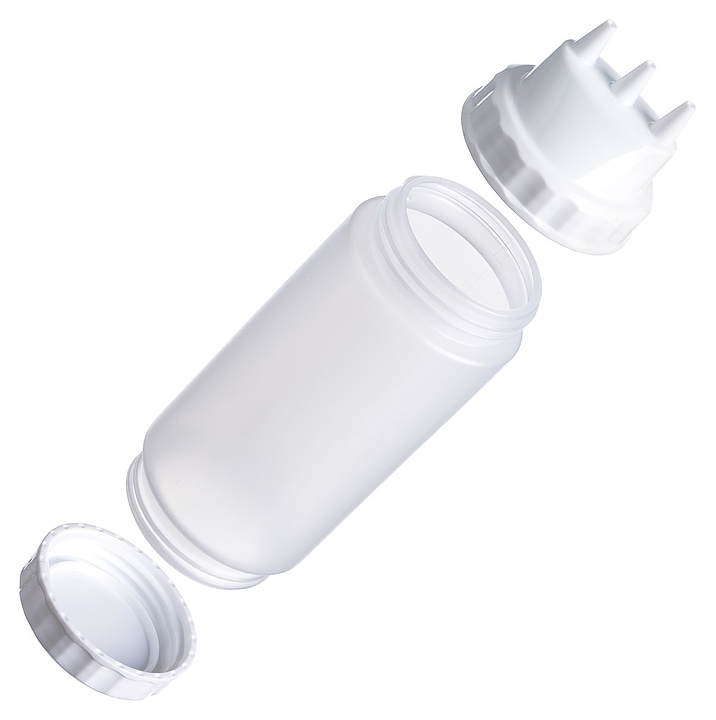 Диспенсер для соуса Gastroplast 79673 500 мл d=7 см h=20 см (пластик) прозрачный c 2 белыми крышками и 3 носиками