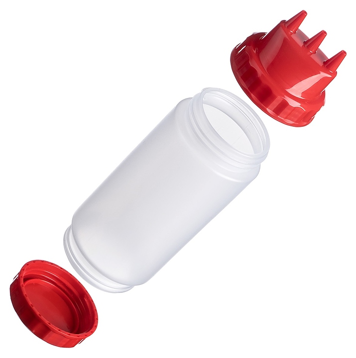 Диспенсер для соуса Gastroplast 79671 500 мл d=7 см h=20 см (пластик) прозрачный c 2 красными крышками и 3 носиками