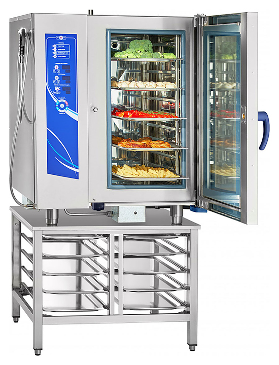 Пароконвектомат Abat ПКА 10-1/1ВМ2-01 предназначен для обжаривания, приготовления на пару, бланширования, запекания и других видов тепловой обработки продуктов на предприятиях общественного питания и торговли. Оборудование заменяет сразу несколько видов приборов: плиту, конвекционную печь, жарочный шкаф, духовку, опрокидывающуюся сковороду, пищеварочный котел, фритюрницу и др. Приготовленные в пароконвектомате блюда сохраняют все полезные вещества. Модель оснащена подсветкой, легкосъемным жировым фильтром, душем для мойки и дверью с двойным остеклением. Пароконвектомат используется совместно с вытяжным зонтом Abat ЗВВ-800. Рекомендуется дополнительно приобрести водоумягчитель и фильтр-систему для очистки и смягчения воды. Подробнее о необходимости водоподготовки читайте здесь. Особенности: