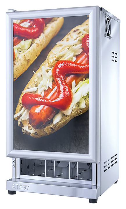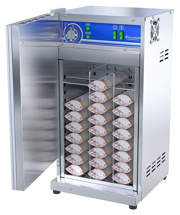 Тепловой шкаф ATESY ФИОЛЕНТ ШТХ-24-350.350-01 используется на предприятиях общественного питания и торговли для непродолжительного хранения в теплом состоянии готовых упакованных хот-догов, пирожков и другого фаст-фуда. Модель оснащена распашной дверцей со специальной панелью (лайтбоксом) для размещения рекламного баннера. Изделие выполнено из нержавеющей стали. Особенности: