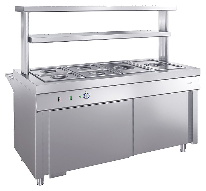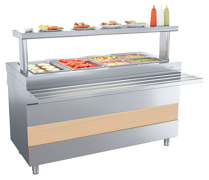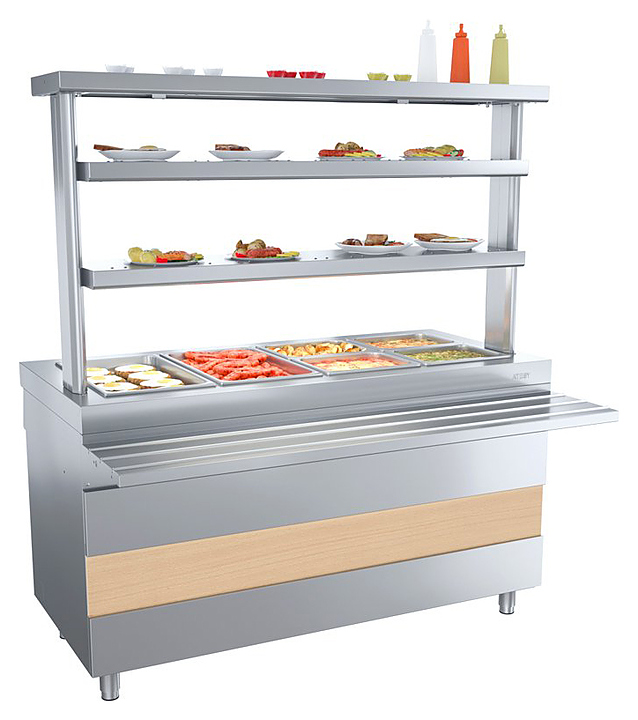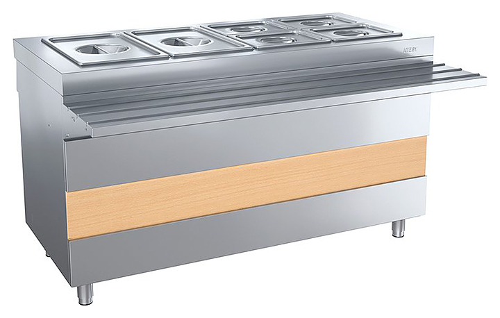 Мармит ATESY Ривьера М2-1500-02-СО используется в составе линии раздачи Ривьера на предприятиях общественного питания и торговли для поддержания в горячем состоянии гастроемкостей со вторыми блюдами, гарнирами и соусами. Модель оснащена герметичной ванной для размещения гастроемкостей и терморегулятором, позволяющим осуществлять настройку температуры нагрева гастроемкостей. Столешница выполнена из нержавеющей стали AISI 430 и усилена листом ламинированной ДСП толщиной 16 мм, ванна - из нержавеющей стали, ножки - из нержавеющей стали и пластиковой опорной части. В комплект поставки входят 3 съемные перемычки из нержавеющей стали П-образной формы, позволяющие устанавливать гастроемкости формата GN 1/2 и GN 1/3, направляющая для подносов и съемная декоративная панель цвета и текстуры D2413 Дуб. Гастроемкости в комплект поставки не входят и приобретаются отдельно. Особенности: