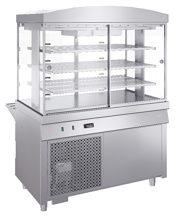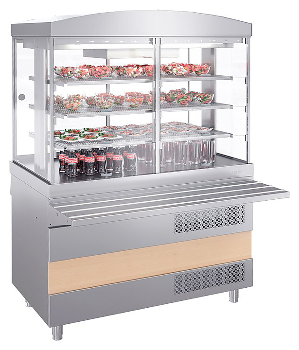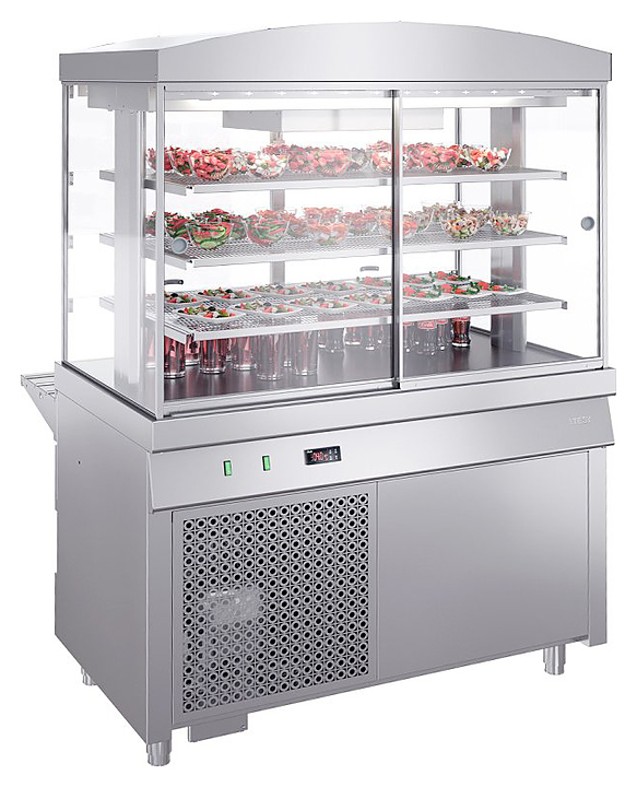 Холодильная витрина ATESY Ривьера ХВ-1200-02 используется на предприятиях общественного питания и торговли для кратковременного хранения, демонстрации и раздачи холодных напитков, салатов, кисломолочных продуктов и других блюд, требующих хранения в охлажденном состоянии. Модель оснащена 3 вместительными съемными перфорированными полками. Столешница выполнена из нержавеющей стали AISI 430 и усилена листом ламинированной ДСП толщиной 16 мм, боковые стенки витрины и двери со стороны обслуживающего персонала - из стеклопакетов, дверцы со стороны покупателя - из оргстекла, полки и ;направляющая для подносов - из нержавеющей стали, ножки - из нержавеющей стали с пластиковой опорной частью.