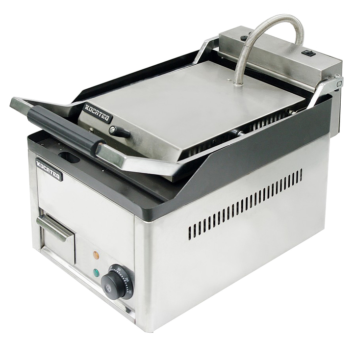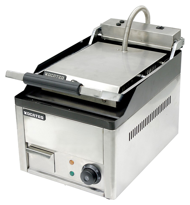 Гриль-сковорода Kocateq GH300FRNW предназначена для приготовления жареных мясных блюд, яичницы, жареной рыбы, оладьев, котлет и гамбургеров на предприятиях общественного питания и торговли. Модель оснащена термостатом для регулировки температуры и защитным термостатом, автоматически отключающим напряжение при повреждении основного термостата. Рабочая поверхность выполнена из стали толщиной 10 мм с тефлонированным покрытием, корпус - из нержавеющей стали AISI 430 толщиной 0,8 мм, ножки - из пластика. Особенности: