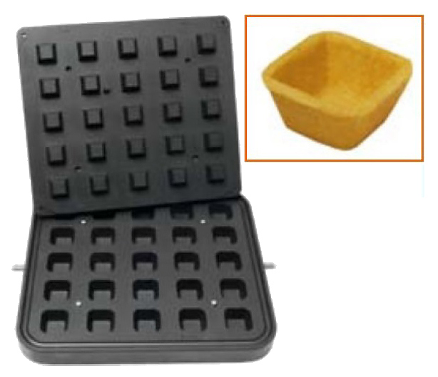 Форма Kocateq DHTartmatic Plate 37 используется совместно с тарталетницей DHTartmatic на предприятиях общественного питания и торговли, в пекарнях и кондитерских для выпечки тарталеток. Изделие представляет собой 2 пластины, одна из которых с выемками крепится к неподвижной станине тарталетницы, другая с выпуклостями - к верхней подвижной части. Модель оснащена 25 квадратными формами. Антипригарное покрытие пластин выполнено из теплопроводящего сплава. Характеристики: