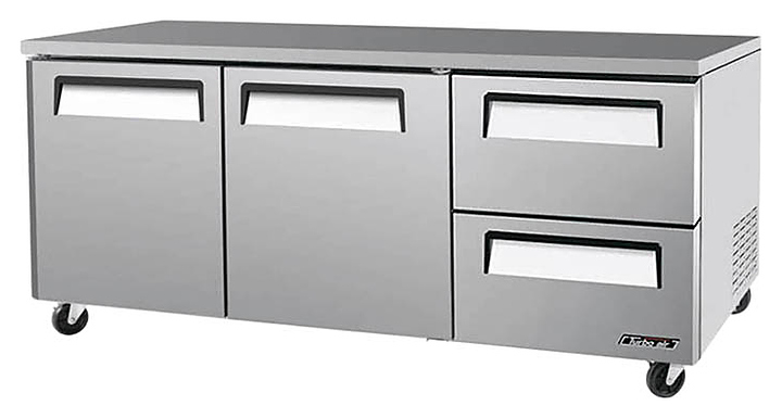 Холодильный стол Turbo air CMUR-72-2D-2 предназначен для раскатки теста, обработки, охлаждения и кратковременного хранения продуктов и напитков на предприятиях общественного питания и торговли. Корпус выполнен из нержавеющей стали (гальванизированная сталь на оборотной стороне и внизу) с применением пожаробезопасных стенок толщиной 60 мм, уплотнения - из АБС-пластика, пол - из нержавеющей стали с алюминиевыми вставками по бокам и сзади оборудования, регулируемые полки - из толстой стальной проволоки с виниловым покрытием, тройные направляющие - из высококачественной нержавеющей стали. Особенности: