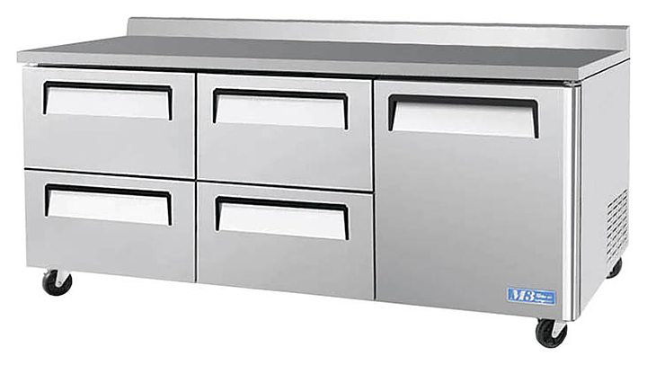 Холодильный стол Turbo air CMWR-72-2D-4 предназначен для раскатки теста, обработки, охлаждения и кратковременного хранения продуктов и напитков на предприятиях общественного питания и торговли. Корпус выполнен из нержавеющей стали (гальванизированная сталь на оборотной стороне и внизу) с применением пожаробезопасных стенок толщиной 60 мм, уплотнения - из АБС-пластика, пол - из нержавеющей стали с алюминиевыми вставками по бокам и сзади оборудования, регулируемые полки - из толстой стальной проволоки с виниловым покрытием, тройные направляющие - из высококачественной нержавеющей стали. Особенности: