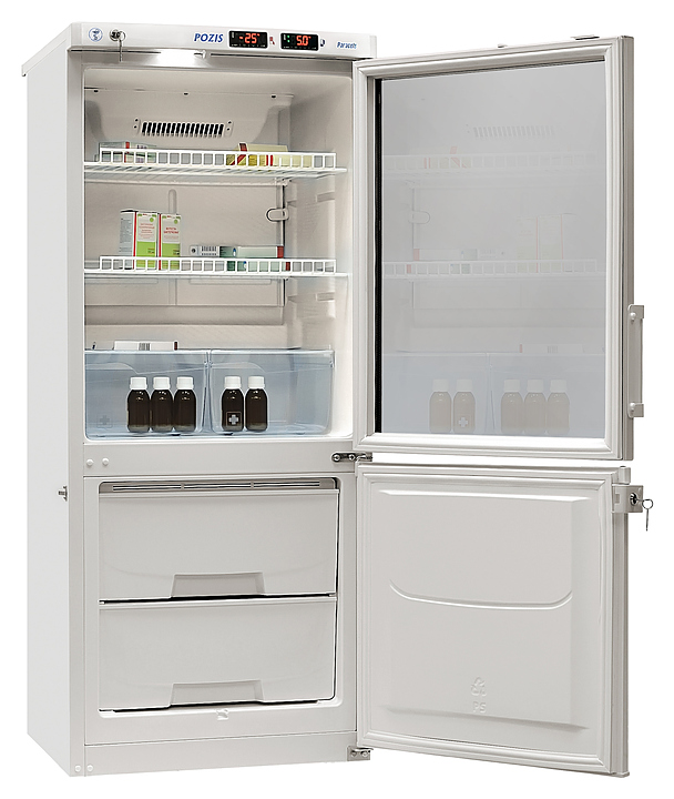 Фармацевтический шкаф POZIS ХЛ-250 предназначен для хранения лекарственных, биологических, ветеринарных препаратов в аптеках, медицинских, больничных и научно-исследовательских учреждениях, диагностических центрах и на предприятиях фармацевтической отрасли. Модель оснащена дверью с тонированным стеклом и металлической дверью с замками, 2 роликами и 2 регулируемыми опорами. Для удобства пользования дисплеи, отображающие температуру, располагаются над дверью в зоне постоянной видимости. Внутренний шкаф и панели дверей выполнены из полимерных материалов с антимикробным покрытием, теплоизоляция - из пенополиуретана, герметизация дверных проемов - из уплотнителей с магнитными вставками. Особенности: