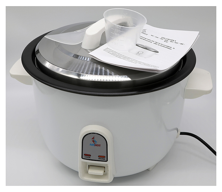 Рисоварка Airhot RC-42E используется на предприятиях общественного питания и торговли, а также в домашних условиях для приготовления риса всех сортов. Процесс приготовления весьма прост: достаточно загрузить нужное количество риса в емкость и залить его соответствующим количеством воды. Модель оснащена съемной чашей с мерной шкалой и панелью управления с индикаторами режимов "Готовка" / Подогрев". В комплект поставки входят мерный стакан и ложка для риса. Дополнительные характеристики: