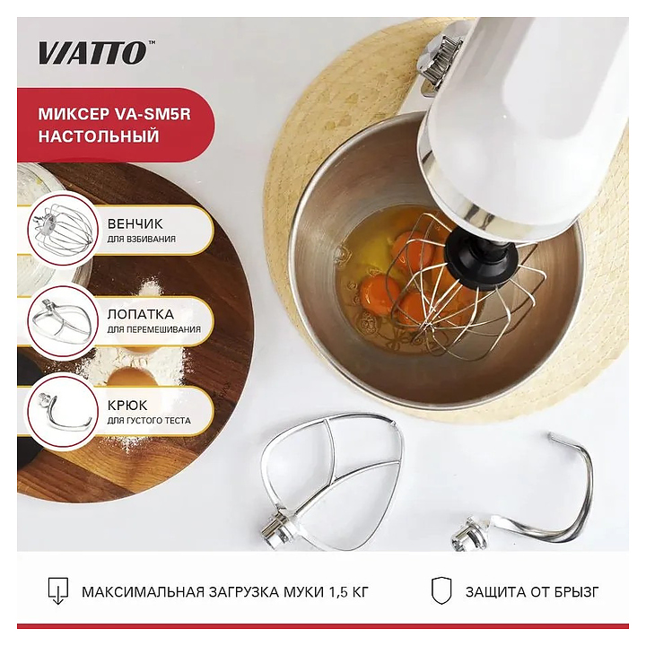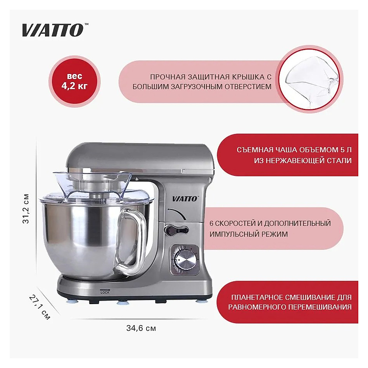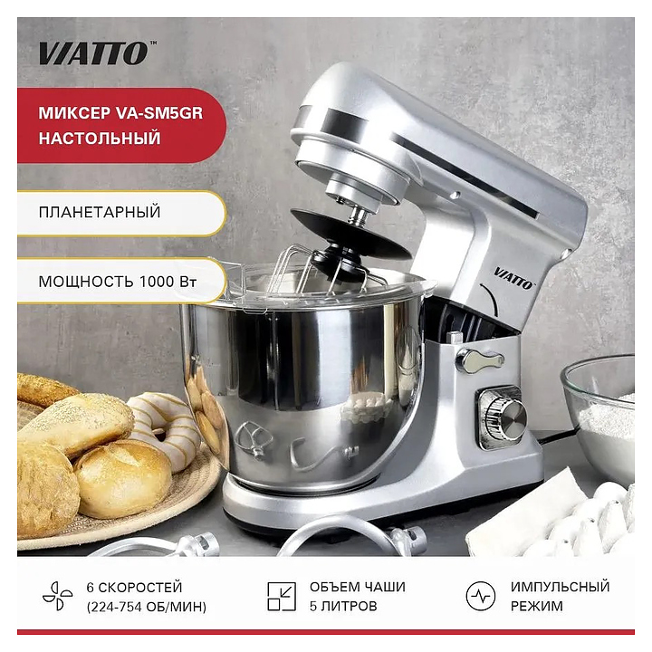 Планетарный миксер VIATTO VA-SM5GR (grey / серый) предназначен для замеса различных видов теста, а также для взбивания кремов, муссов и приготовления пюре, соусов и коктейлей на предприятиях общественного питания и торговли. Модель оснащена съемной дежей с ручкой и защитной крышкой. Корпус выполнен из ABS-пластика, дежа - из нержавеющей стали. В комплект поставки входят 3 насадки: крюк, лопатка и венчик. Дополнительные характеристики:
