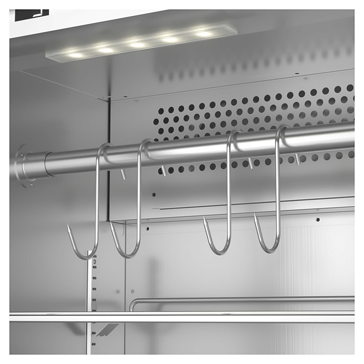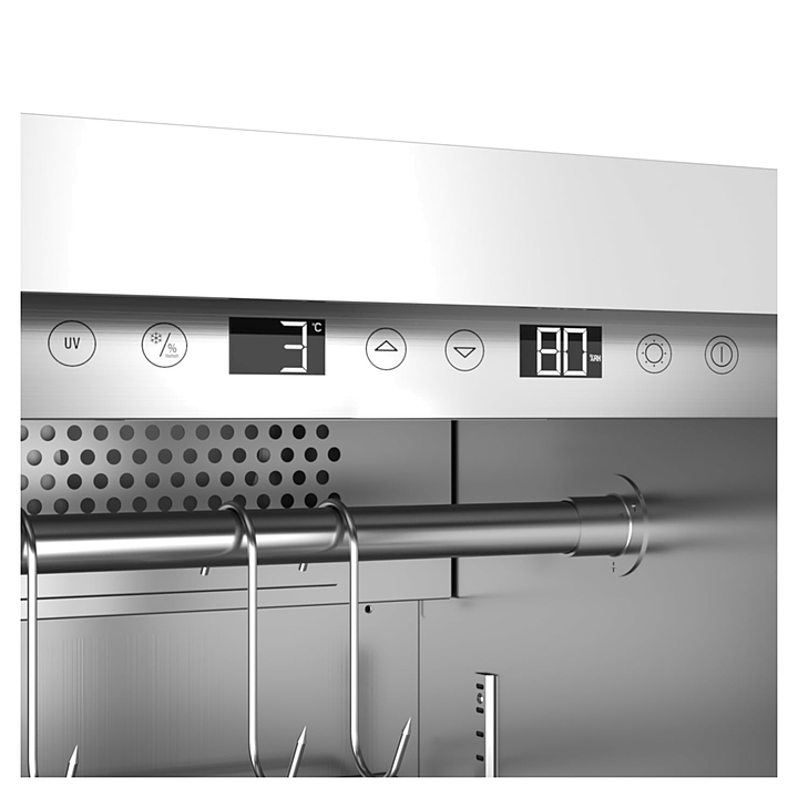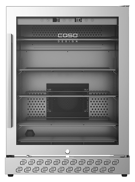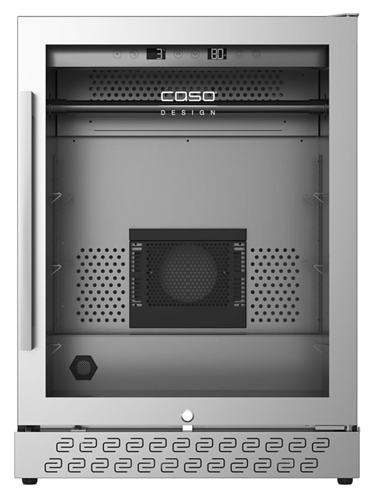 Шкаф для мяса CASO DryAged Master 125 предназначен для охлаждения и вызревания мяса и колбас на предприятиях пищевой промышленности, общественного питания и торговли, а также в частных домах и квартирах. Модель оснащена сенсорной панелью управления, съемным контейнером для воды и замком. Корпус выполнен из нержавеющей стали, дверца - из стекла с ультрафиолетовым фильтром. В комплект поставки входят 4 полки и вешалка с крючками для мяса из нержавеющей стали. Особенности: