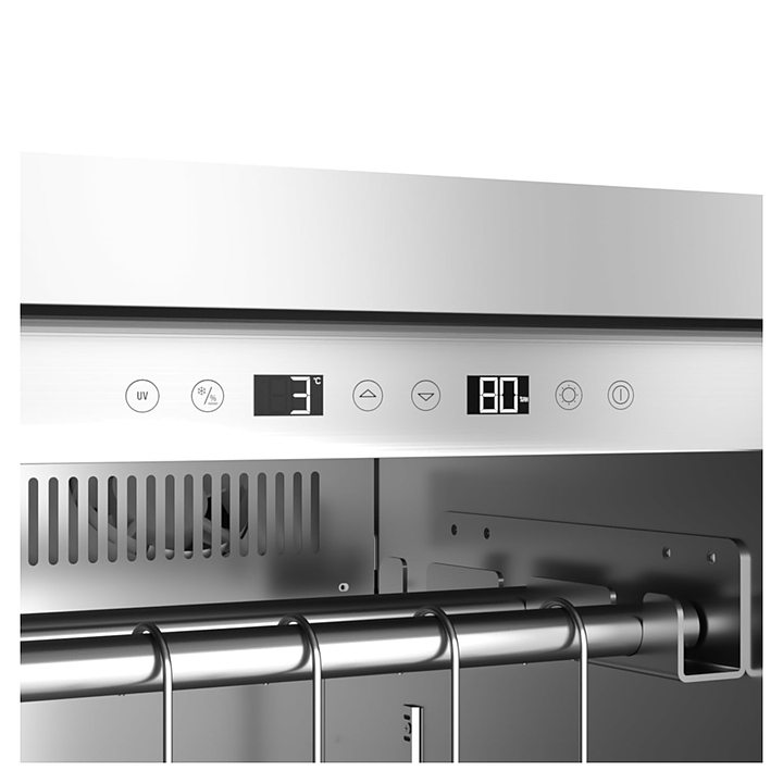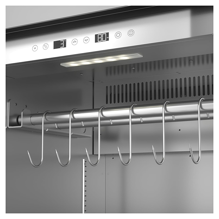 Шкаф для мяса CASO DryAged Master 380 Pro предназначен для охлаждения и вызревания мяса и колбас на предприятиях пищевой промышленности, общественного питания и торговли, а также в частных домах и квартирах. Модель оснащена сенсорной панелью управления, съемным контейнером для воды и замком. Корпус выполнен из нержавеющей стали, дверца - из стекла с ультрафиолетовым фильтром. В комплект поставки входят 7 полок и вешалка с крючками для мяса из нержавеющей стали. Особенности: