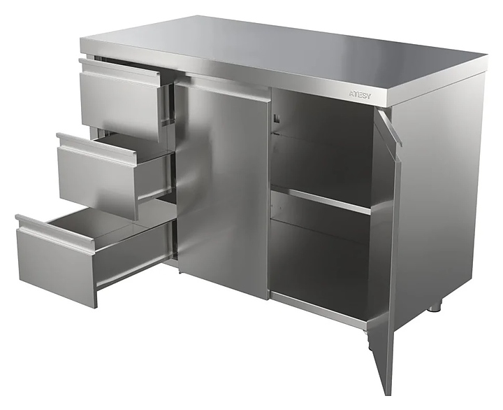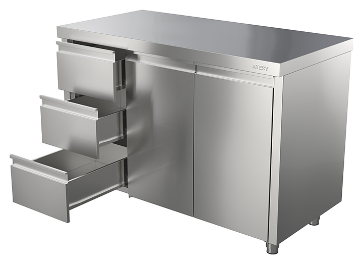 Производственный стол ATESY СТ-С-1200.600-02-Р-3Л используется на предприятиях общественного питания и торговли для разделывания и обработки пищевых продуктов, а также в качестве вспомогательной поверхности для кухонного оборудования и места хранения кухонной посуды, инвентаря и сухих продуктов. Модель оснащена 1 полкой, 3 выдвижными ящиками, 2 распашными дверцами. Столешница, двери и боковые панели выполнены из нержавеющей стали AISI 430, дно и задняя стенка - из оцинкованной стали, ножки - из нержавеющей стали с пластиковой опорной частью, столешница укреплена с внутренней стороны листом ламинированной древесно-стружечной плиты. Особенности: