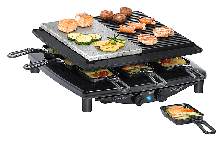 Гриль-раклетница Steba RC 4 plus предназначен для жарки мяса, рыбы и овощей с одновременным плавлением сыра в частных домах, квартирах, отелях и офисах. Модель оснащена панелью управления с поворотными регуляторами, светодиодным индикатором работы, съемными пластинами для гриля и лотком для стока жира. В комплект поставки входят 8 порционных сковородок, пластина для гриля из натурального камня и литая пластина с антипригарным покрытием. Особенности: