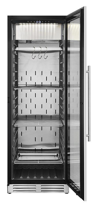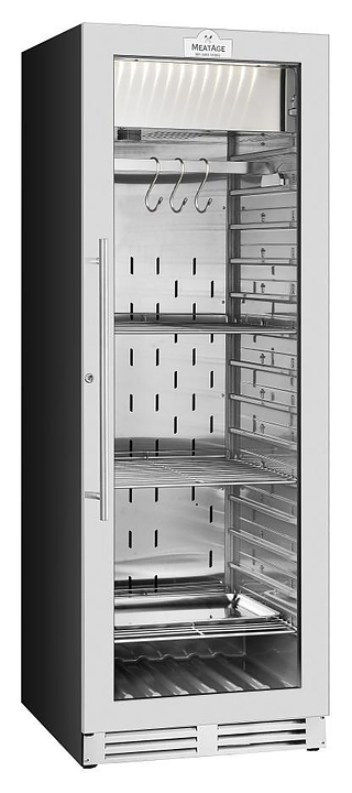 Шкаф для мяса MeatAge VI180 WT предназначен для охлаждения и вызревания мяса, ветчины и салями в частных домах, квартирах, отелях и офисах. Модель оснащена акустической сигнализацией и запираемой дверью. Корпус и комплектующие выполнены из нержавеющей стали AISI 304, дверца - из ударопрочного закаленного стекла. Комплектация: