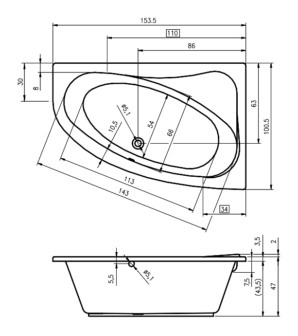 Ванна RIHO ARYL LEFT 153x100 см, акрил