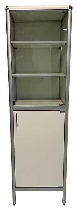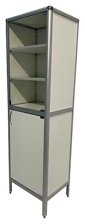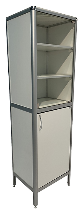 Лабораторный шкаф Мед Мебель MED 17.003al предназначен для хранения различного инвентаря и других предметов, которые используются в лабораториях и медучреждениях. Модель оснащена полками, дверцами и регулируемыми по высоте ножками. Шкаф выполнен из ЛДСП, каркас - из алюминиевого профиля, верхняя дверца - из стекла. Особенности: