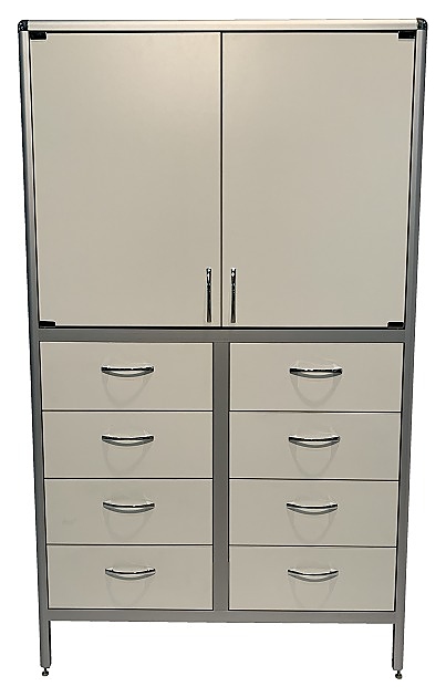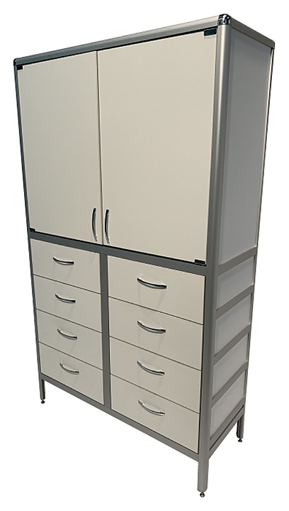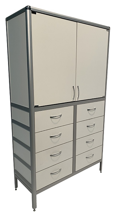 Лабораторный шкаф Мед Мебель MED 17.014al с РУ предназначен для хранения различного инвентаря и других предметов, которые используются в лабораториях и медучреждениях. Модель оснащена полками, дверцами, выдвижными ящиками в нижней секции и регулируемыми по высоте ножками. Шкаф выполнен из ЛДСП, каркас - из алюминиевого профиля. Особенности: