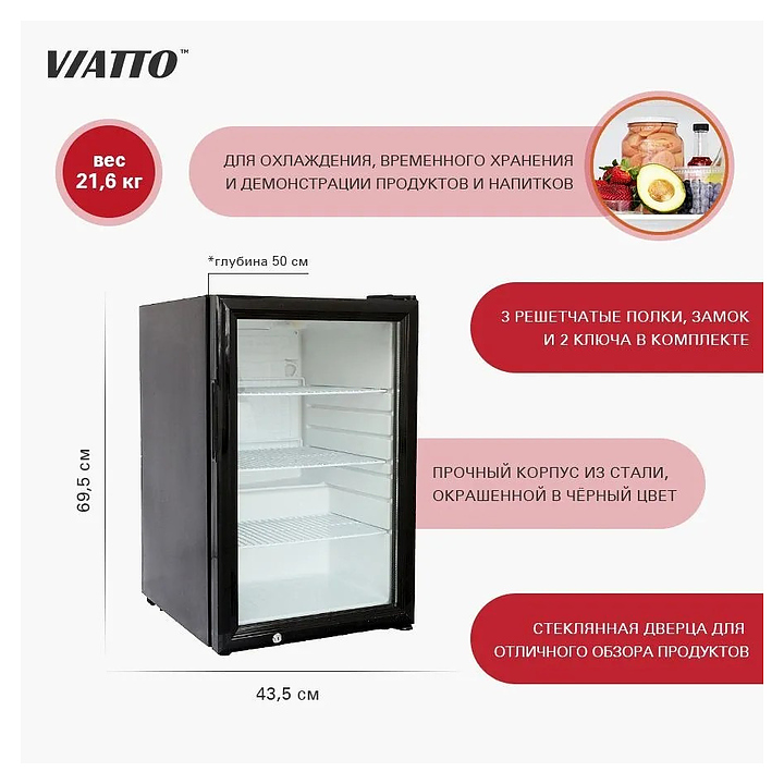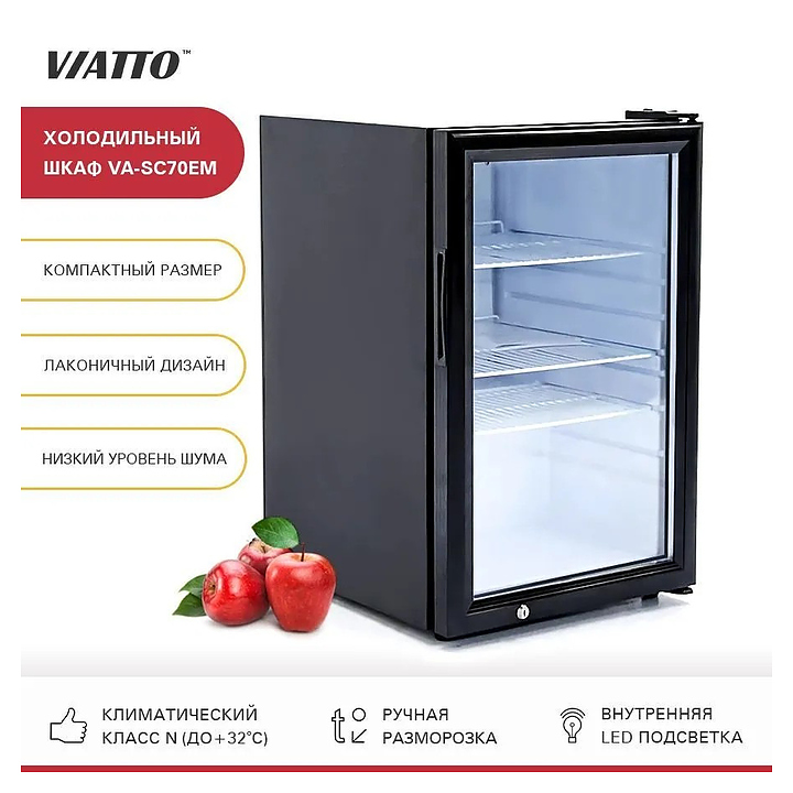Холодильный шкаф VIATTO VA-SC70EM предназначен для охлаждения, временного хранения и демонстрации продуктов и напитков на предприятиях общественного питания и торговли. Модель оснащена распашной, стеклянной дверцей и рамой из нержавеющей стали и 3 решетчатыми полками. Корпус выполнен из окрашенной стали, внутренняя камера- из пластика. Особенности: