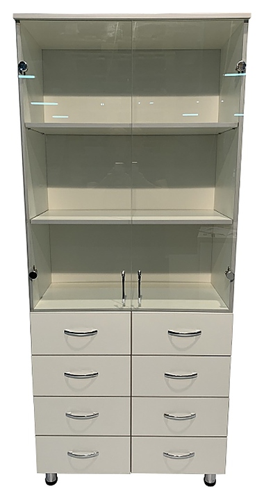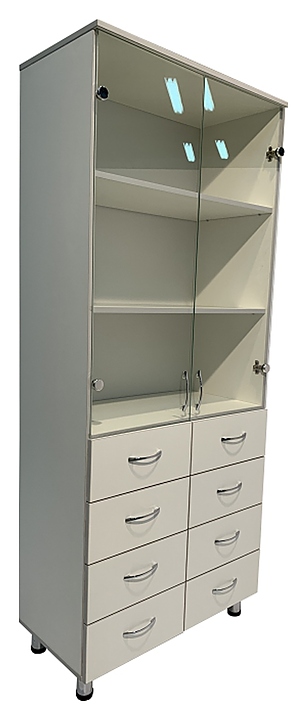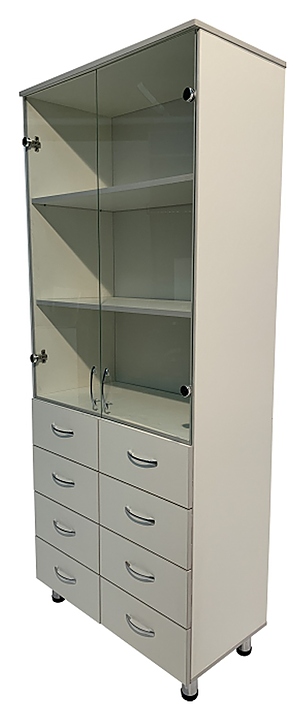 Медицинский шкаф Мед Мебель MD ШМ 14.41 предназначен для размещения и систематизации медицинской документации и оптимизации пространства в медицинских учреждениях. Модель оснащена полками, дверцами, выдвижными ящиками и регулируемыми по высоте ножками. Шкаф выполнен из ЛДСП, дверцы - из стекла. Особенности: