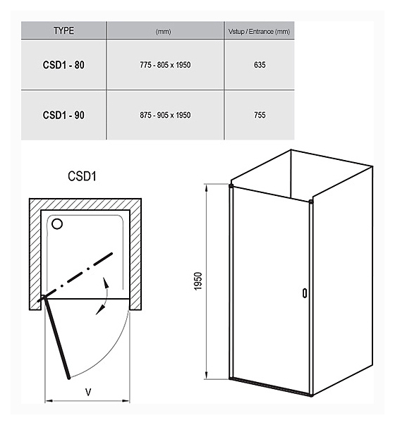 Дверь душевая Ravak Chrome CSD1 90х195 см, распашная, Transparent, профиль полированный алюминий
