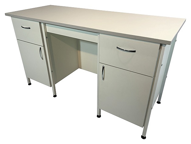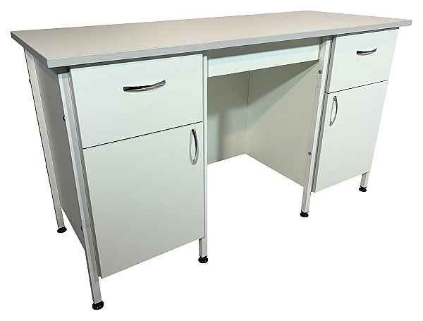 Стол лабораторный Мед Мебель СЛ 12.017 с РУ предназначен для организации рабочего места сотрудника медицинской лаборатории. Модель оснащена тумбами по краям, каждая из которых - с ящиком дверцей, перемычкой, придающей изделию дополнительную прочность, и регулируемыми по высоте ножками за счет винтовых опор-регуляторов. Каркас обеспечивает жесткость, устойчивость и прочность конструкции. Обшивка стола и столешница выполнены из ЛДСП, каркас - из стального профиля, покрытого порошковой краской. Стол поставляется с регистрационным удостоверением. Особенности: