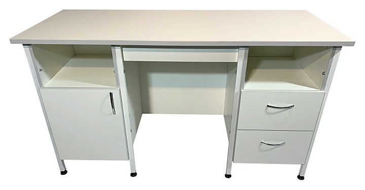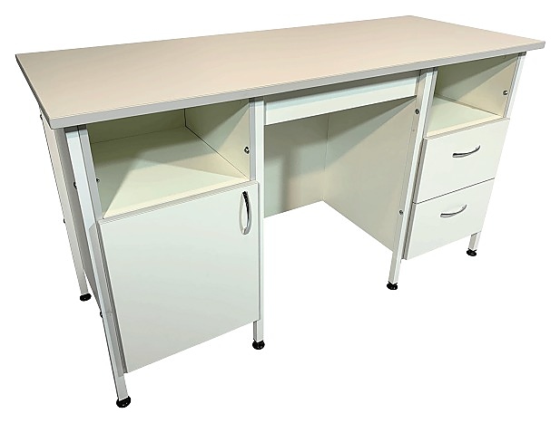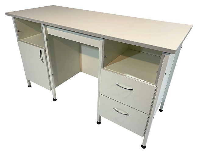 Стол лабораторный Мед Мебель СЛ 12.020 с РУ предназначен для организации рабочего места сотрудника медицинской лаборатории. Модель оснащена тумбами по краям, тумба слева - с нишей и дверцей, справа - с нишей и 2 выдвижными ящиками, перемычкой, придающей изделию дополнительную прочность, и регулируемыми по высоте ножками за счет винтовых опор-регуляторов. Каркас обеспечивает жесткость, устойчивость и прочность конструкции. Обшивка стола и столешница выполнены из ЛДСП, каркас - из стального профиля, покрытого порошковой краской. Стол поставляется с регистрационным удостоверением. Особенности: