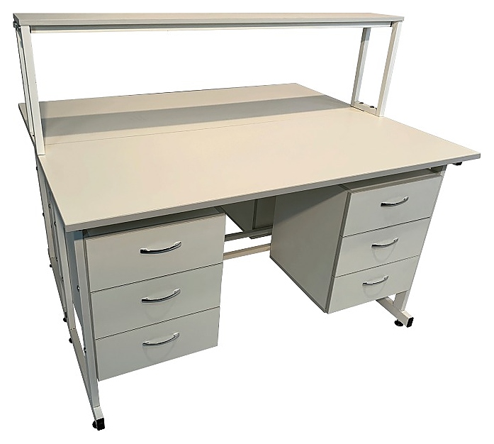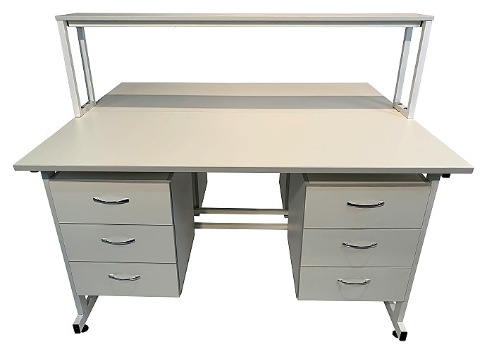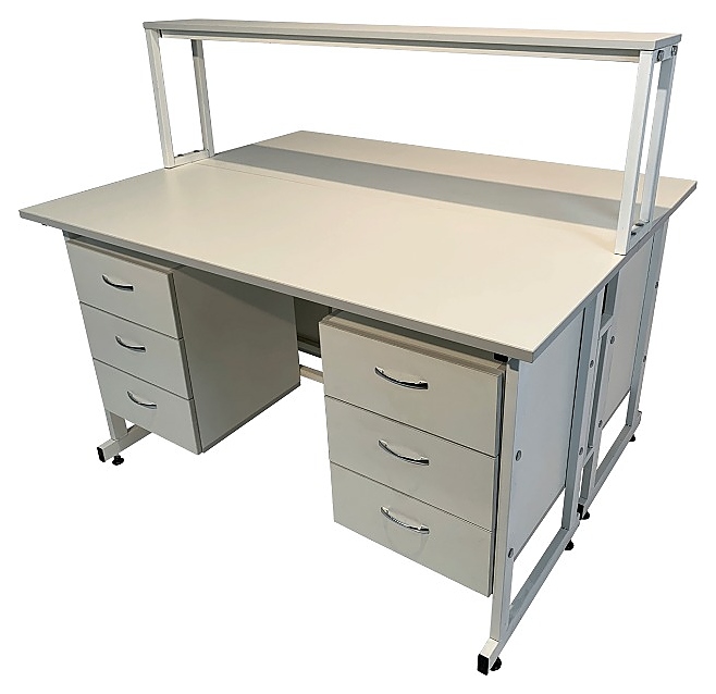 Островной лабораторный стол Мед Мебель Сло 22.011 с РУ предназначен для оптимизации и рационального использования рабочего места сотрудников лабораторий. Модель оснащена 4 тумбами с 3 ящиками каждая, надстройкой-полкой посередине столешницы, которой могут пользоваться одновременно два сотрудника, и регулируемыми по высоте ножками за счет винтовых опор-регуляторов. Каркас обеспечивает надежность и прочность конструкции. Столешница выполнена из ЛДСП, каркас - из стального профиля, покрытого порошковой краской. Стол поставляется с регистрационным удостоверением. Особенности: