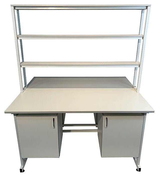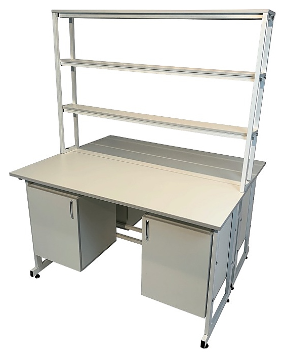 Островной лабораторный стол Мед Мебель Сло 22.022 с РУ предназначен для оптимизации и рационального использования рабочего места сотрудников лабораторий. Модель оснащена надстройкой с 3 полками посередине столешницы, 4 тумбами с дверцей каждая, и регулируемыми по высоте ножками за счет винтовых опор-регуляторов. Каркас обеспечивает надежность и прочность конструкции. Столом могут пользоваться одновременно 2 сотрудника. Столешница, полки и тумбы выполнены из ЛДСП, каркас - из стального профиля, покрытого порошковой краской. Стол поставляется с регистрационным удостоверением. Особенности:
