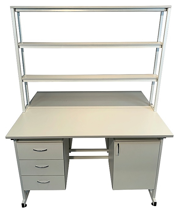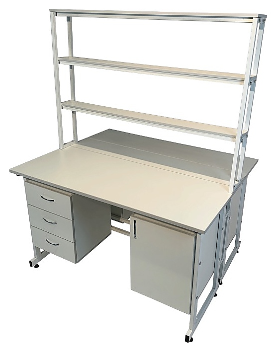 Островной лабораторный стол Мед Мебель Сло 22.024 с РУ предназначен для оптимизации и рационального использования рабочего места сотрудников лабораторий. Модель оснащена надстройкой с 3 полками посередине столешницы, 4 тумбами: 2 тумбы - с дверцей, 2 тумбы - с 3 выдвижными ящиками, и регулируемыми по высоте ножками за счет винтовых опор-регуляторов. Каркас обеспечивает надежность и прочность конструкции. Столом могут пользоваться одновременно 2 сотрудника. Столешница, полки и тумбы выполнены из ЛДСП, каркас - из стального профиля, покрытого порошковой краской. Стол поставляется с регистрационным удостоверением. Особенности: