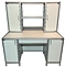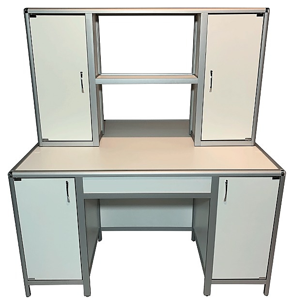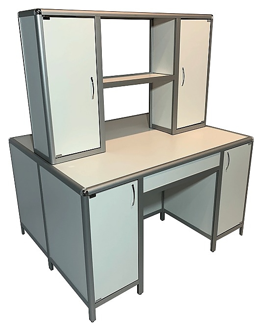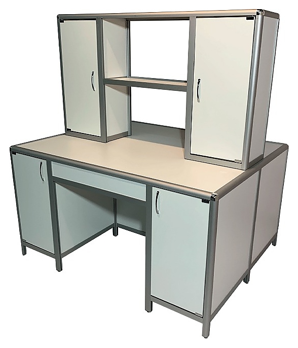Островной лабораторный стол Мед Мебель MED 11.003al с РУ предназначен для организации сразу двух рабочих мест для сотрудников лабораторий или других медучреждений. Модель оснащена надстройкой посередине столешницы над ней, с 2 тумбами и 2 сквозными полками, 2 тумбами под столешницей с дверцей каждая и регулируемыми по высоте ножками. Каркас обеспечивает легкость и прочность конструкции. К столу можно подойти с любой стороны. Столешница и обшивка выполнены из ЛДСП, каркас - из алюминиевого профиля, покрытого порошковой краской. Стол поставляется с регистрационным удостоверением. Особенности:
