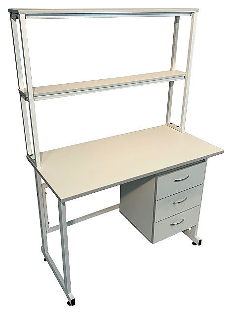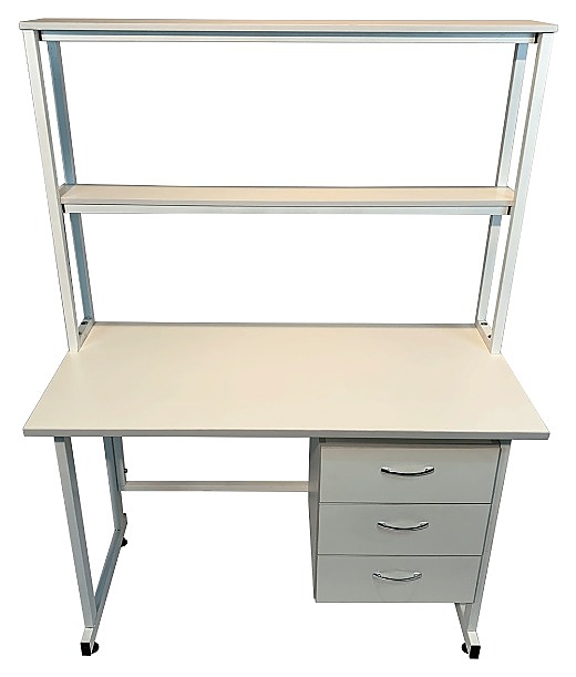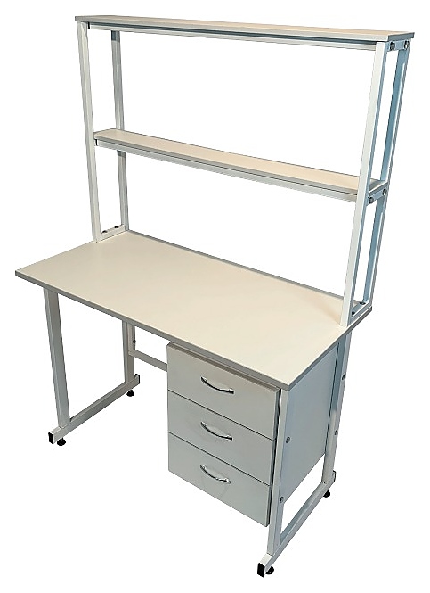 Лабораторный стол с надстройкой Мед Мебель СЛн 16.004 с РУ предназначен для оптимизации и рационального использования рабочего места сотрудников лабораторий. Модель оснащена надстройкой с 2 полками посередине столешницы над ней, тумбой с 3 выдвижными ящиками под столешницей, и регулируемыми по высоте ножками за счет винтовых опор-регуляторов. Каркас обеспечивает надежность и прочность конструкции. Столешница и полки выполнены из ЛДСП, каркас - из стального профиля, покрытого порошковой краской. Стол поставляется с регистрационным удостоверением. Особенности: