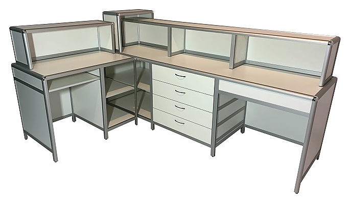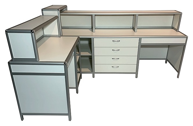 Медицинский стол-пост Мед Мебель MD СтП 11.04al с РУ предназначен для организации рабочего места администратора в медицинских учреждениях. Каркас обеспечивает жесткость, устойчивость и прочность конструкции. Модель оснащена полкой для клавиатуры и полками под столешницей слева, тумбой с 4 выдвижными ящиками под столешницей справа, надстройкой с полками, и опорами на ножках с возможностью регулировки по высоте. Каркас и столешница выполнены из ЛДСП. Особенности: