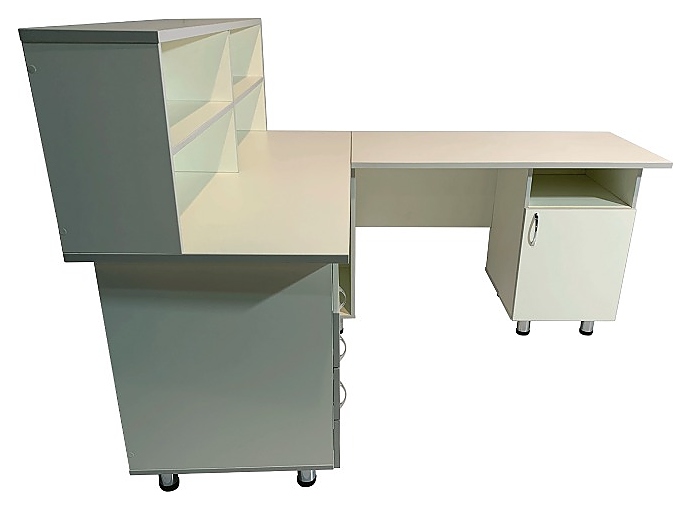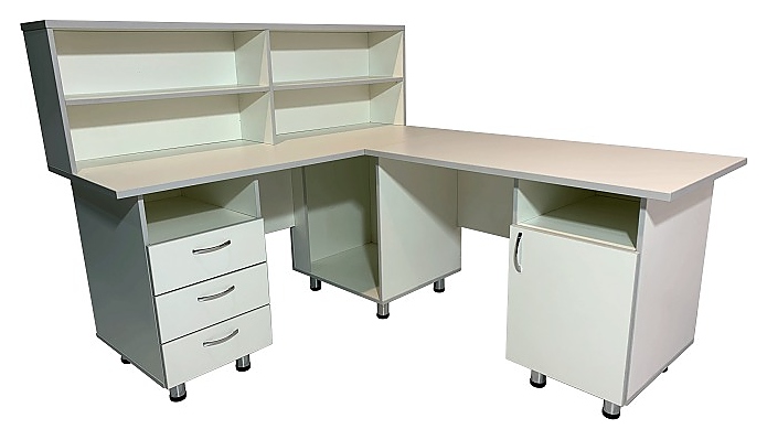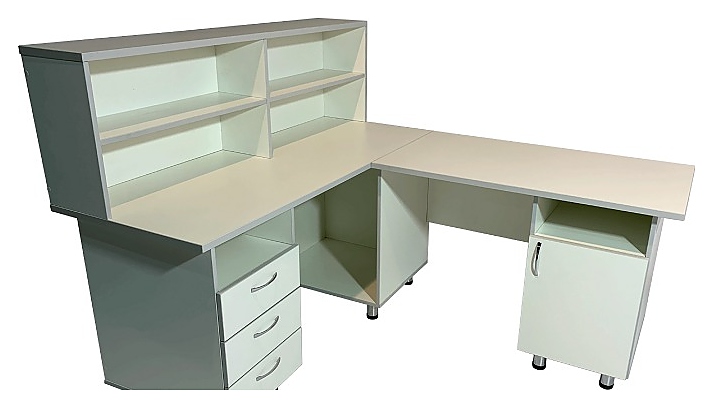 Медицинский стол-пост Мед Мебель MD СтП 11.05 с РУ предназначен для организации рабочего места администратора в медицинских учреждениях. Каркас обеспечивает жесткость, устойчивость и прочность конструкции. Модель оснащена тумбой с нишей и 3 выдвижными ящиками, нишей и надстройкой с полками под столешницей слева, тумбой с нишей и дверцей под столешницей справа, и опорами на ножках с возможностью регулировки по высоте. Каркас и столешница выполнены из ЛДСП. Особенности: