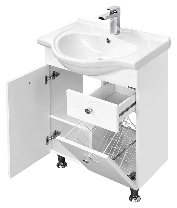 Тумба AQUATON Лиана 60М 1A162901LL010 выполнена в современном стиле. Напольная конструкция обеспечивает легкий монтаж и не требует специального ремонта в помещении. Модель оснащена фасад-створкой с фрезеровкой, за которой находится регулируемая полка для хранения необходимых в ванной комнате принадлежностей, небольшим выдвижным ящиком и откидным фасадом со встроенной бельевой корзиной. Корпус изделия выполнен из влагостойкой ЛДСП, а фасад из высококачественной МДФ и окрашены белоснежной глянцевой полиэфирной краской ультрафиолетового отверждения, которая обеспечивает изделию привлекательный внешний вид, а также износостойкость и долговечность. Тумба используется вместе с раковиной Байкал 60 1WH109652. Комплектация:
