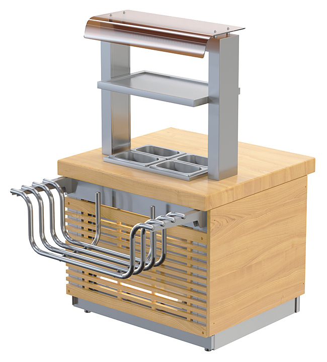 Стойка для столовых приборов ATESY Регата СП-774-940-02 используется на предприятиях общественного питания и торговли для временного хранения и раздачи столовых приборов, хлеба, подносов и салфеток. Модель оснащена полкой для размещения хлеба, светильником и декоративным стеклом. Стойки выполнены из нержавеющей стали AISI430. В комплект поставки входит 4 нержавеющих гастроемкости GN1/4 глубиной 100 мм для размещения столовых и чайных ложек, вилок и ножей. Особенности: