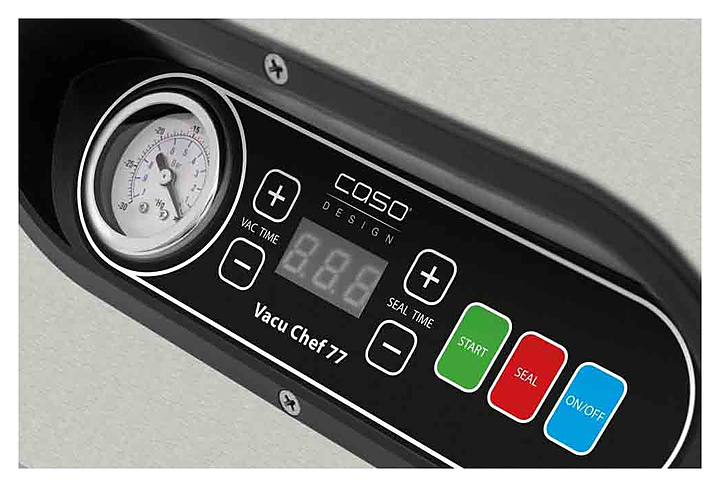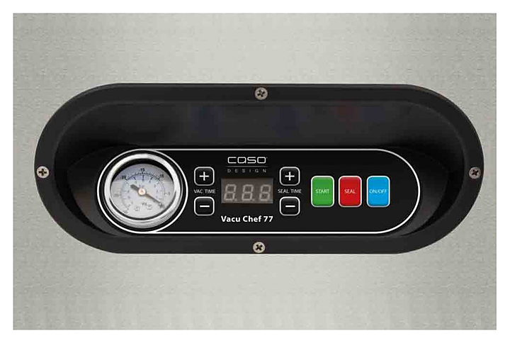 Однокамерный вакуумный упаковщик CASO VacuChef 77 используется на предприятиях пищевой промышленности, общественного питания и торговли для упаковки в вакуум полуфабрикатов и готовых блюд в пакетах для увеличения срока хранения. Модель оснащена сенсорной панелью управления с цифровым дисплеем, манометром, крышкой из закаленного стекла со смотровым окном и двухпоршневым насосом. Корпус и камера выполнены из нержавеющей стали. Особенности: