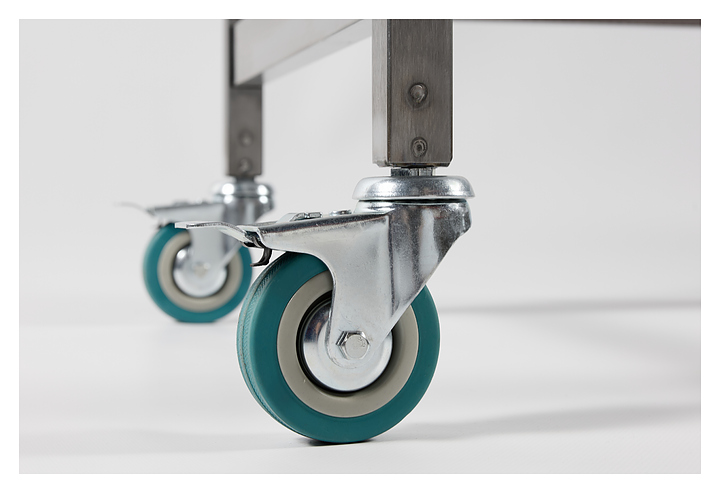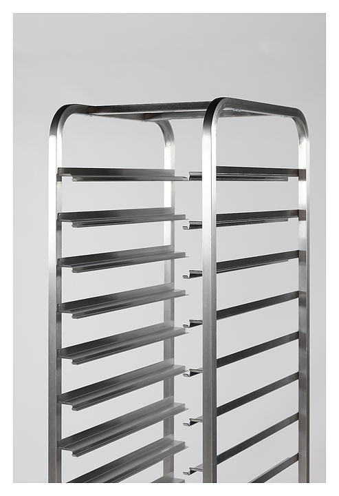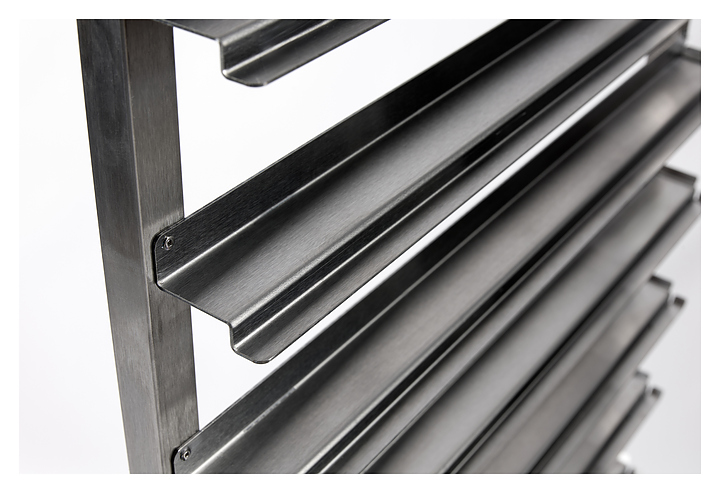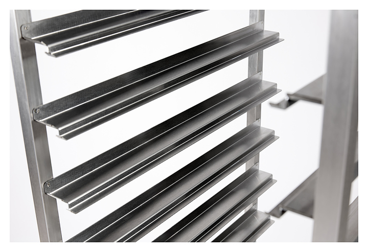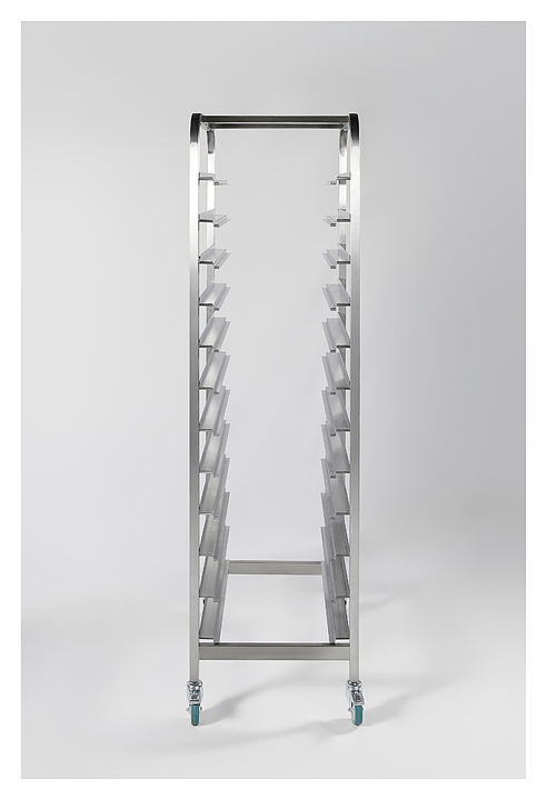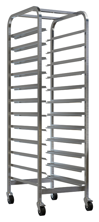 Тележка-шпилька Restoinox ТШРП-12У 600х400 и GN1/1 предназначена для хранения и транспортировки подносов, гастроемкостей и противней на предприятиях общественного питания и торговли. Модель оснащена 4 поворотными колесами, 2 из которых со стопорами. Разборный каркас выполнен из квадратной трубы 25х25 мм нержавеющей стали Aisi 430, направляющие - из нержавеющей стали Aisi 430. Дополнительные характеристики: